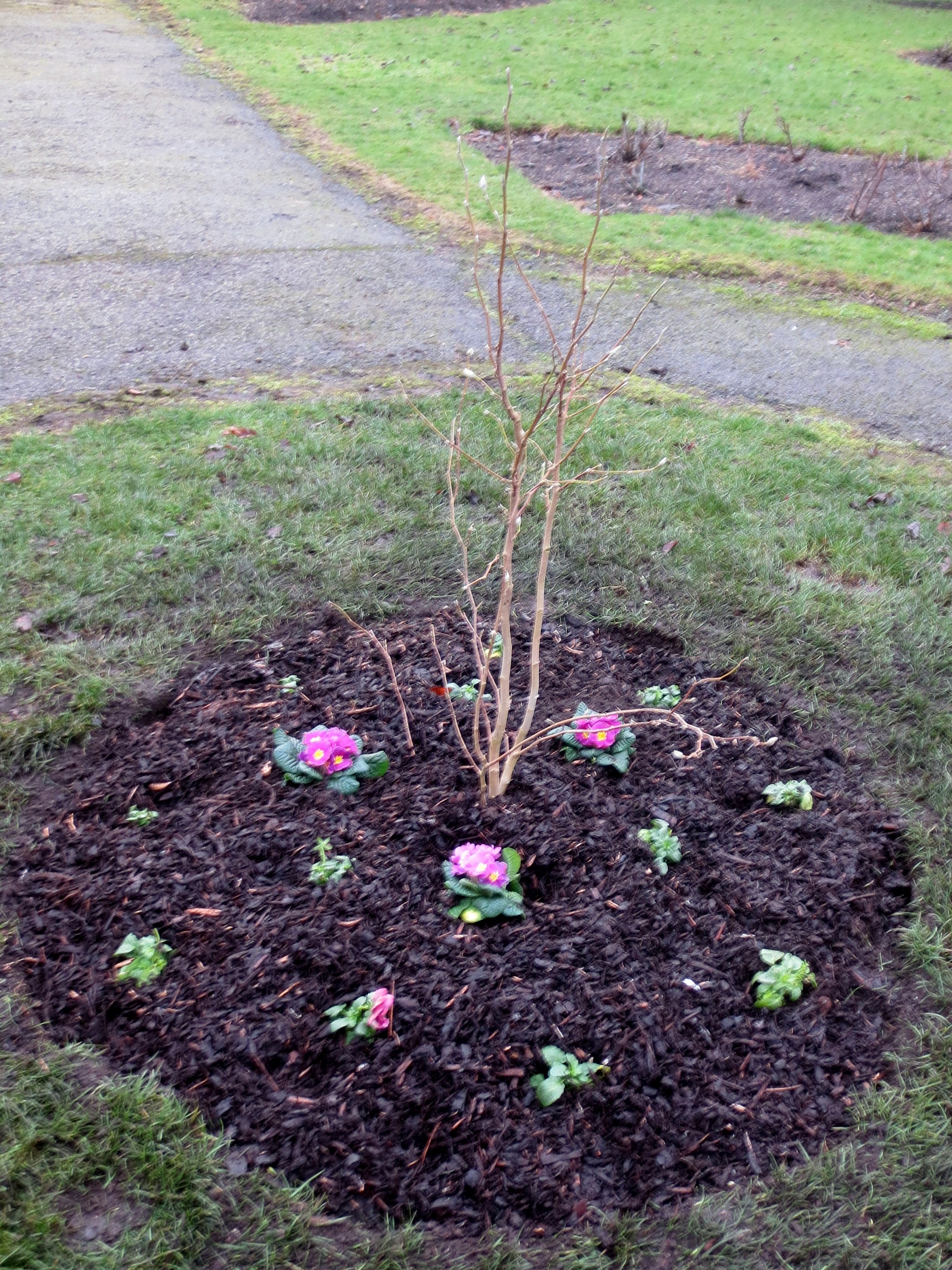 The heavy rain early on Wednesday morning cleared by 9 and it was yet another ideal winter morning for gardening and our CSV Action Earth Event. Councillor Allan Jackson and 15 volunteers turned up. Allan planted a cherry tree in the east border and, altogether, we planted 3 plum trees, two cherries, two witch hazels, 2 clematis and 10 assorted bushes. After a little difficult excavation (thanks Rob!), we also planted a magnolia tree and a few bedding plants right in the centre of the park.