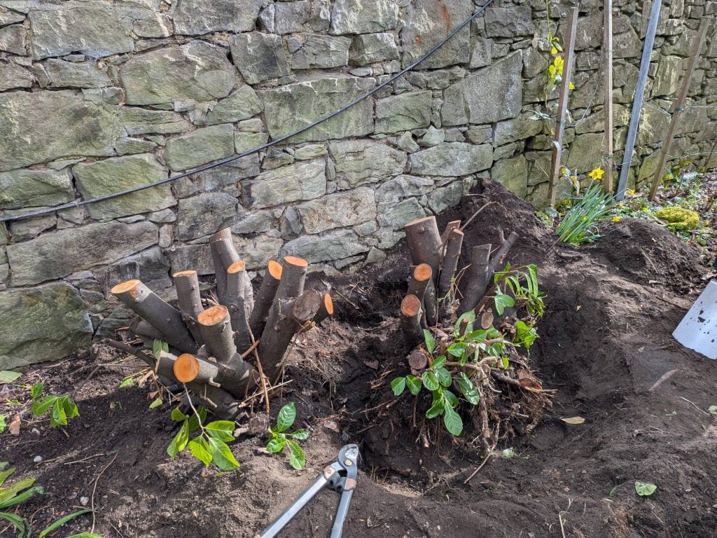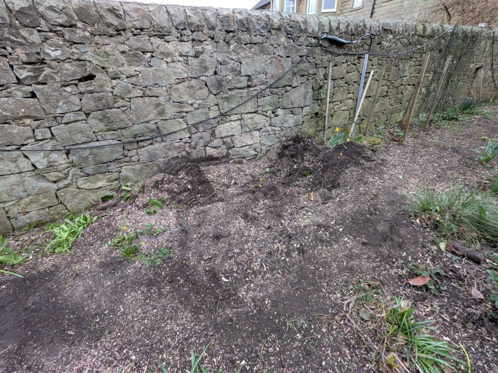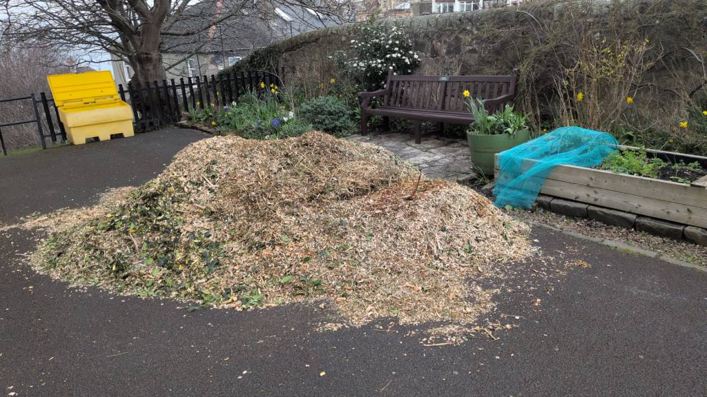What was left of the hedge was turned into woodchip by McLaren Tree Surgery, ready for recycling and to be used on the paths in the flower beds.