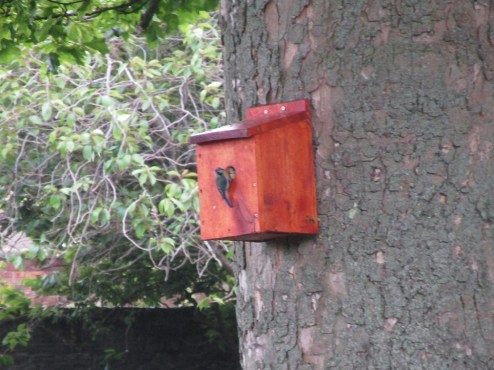There are nests in three or four of the bird boxes, very pleasing. Sorry about the photo, neither the camera nor the cameraman is good enough for this type of photo but you just can see the parent and the baby almost ready to leave.